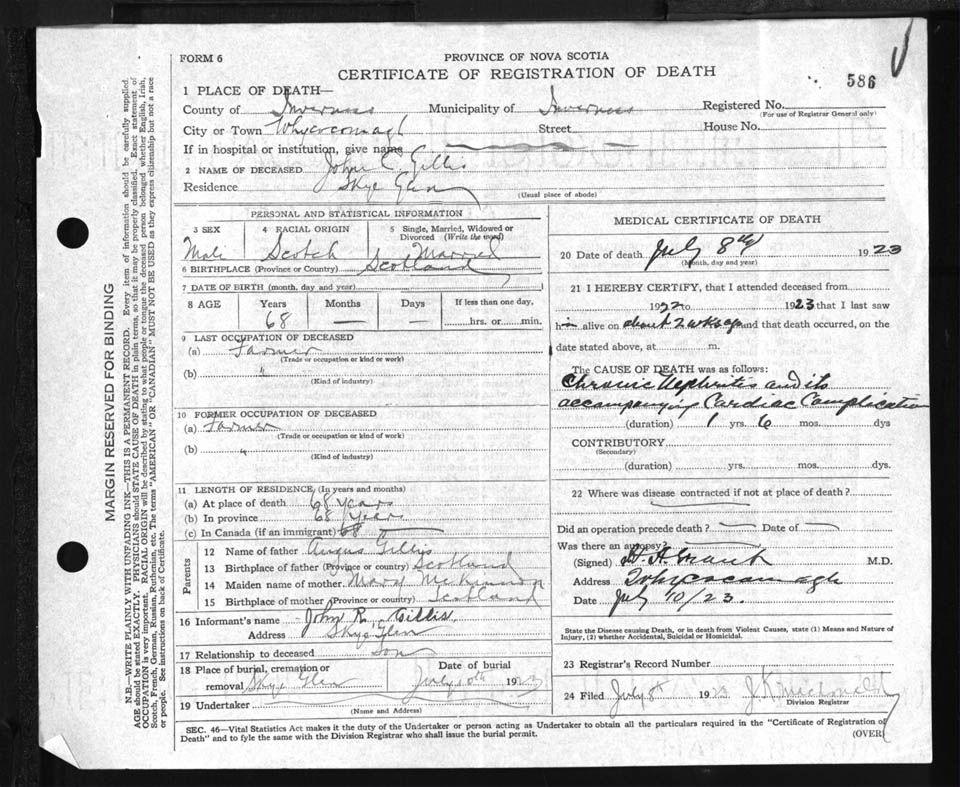 Male Death Registration: Year: 1923 file: 90 number: 586