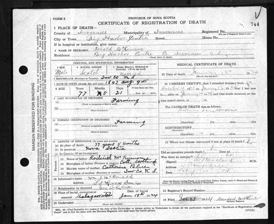 Male Death Registration: Year: 1924 file: 90 number: 744