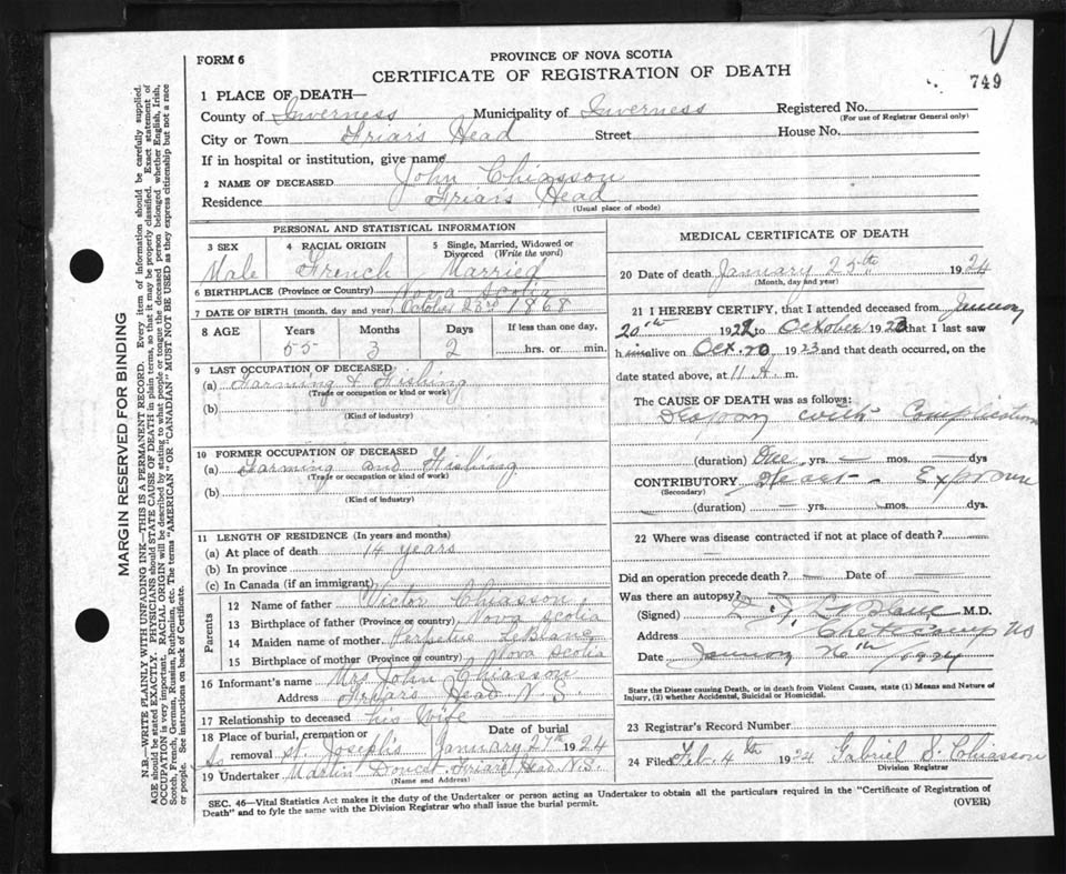 Male Death Registration: Year: 1924 file: 90 number: 749