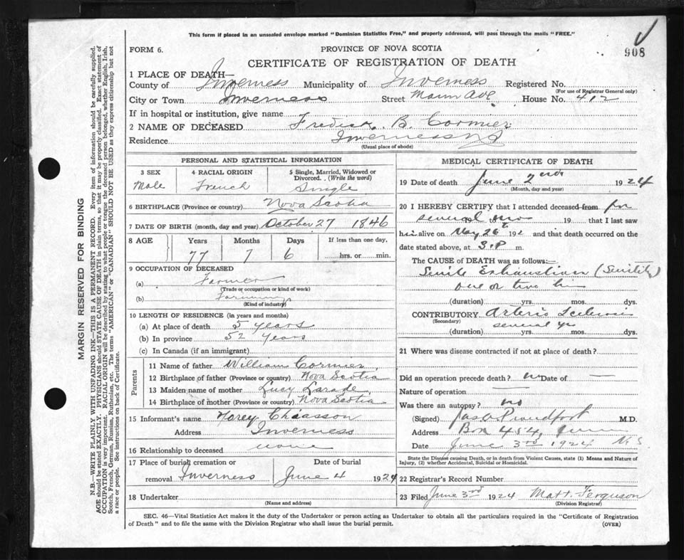 Male Death Registration: Year: 1924 file: 90 number: 908