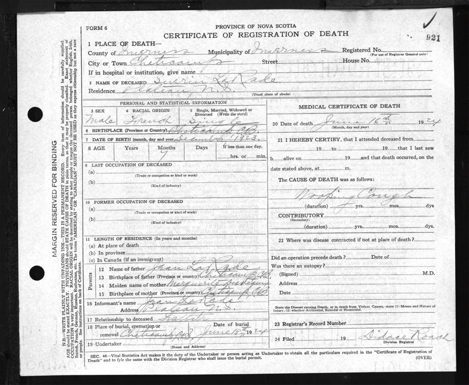 Male Death Registration: Year: 1924 file: 90 number: 921