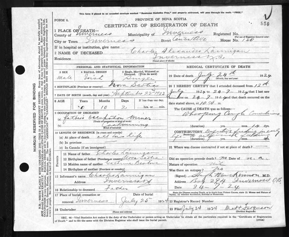 Male Death Registration: Year: 1924 file: 90 number: 950