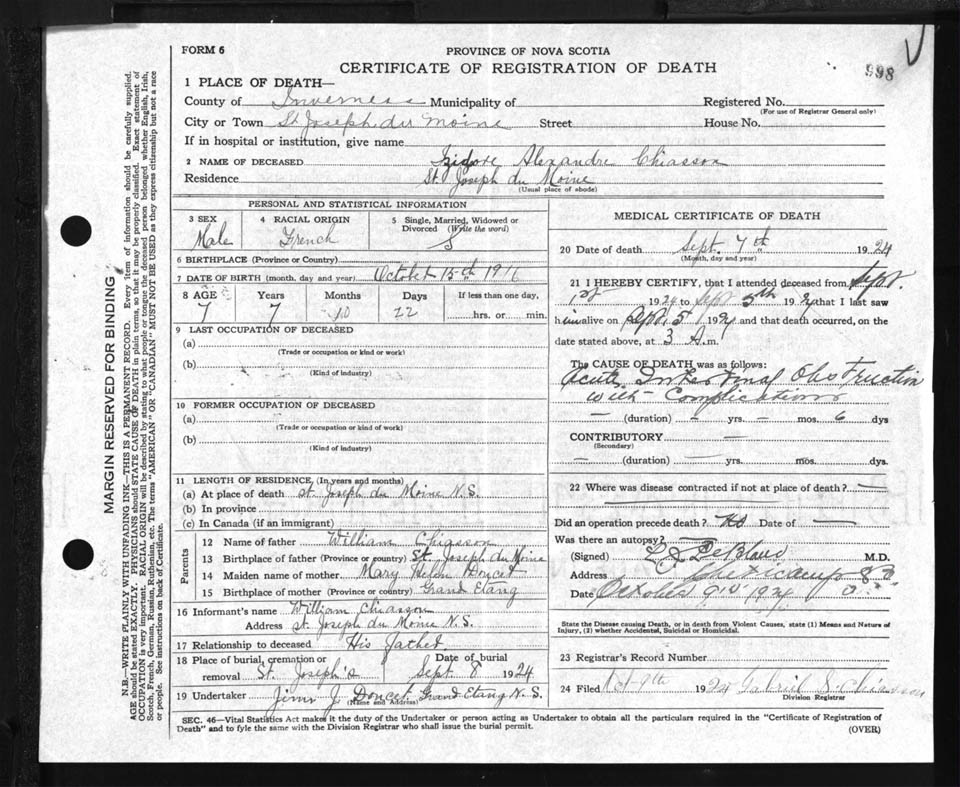 Male Death Registration: Year: 1924 file: 90 number: 998