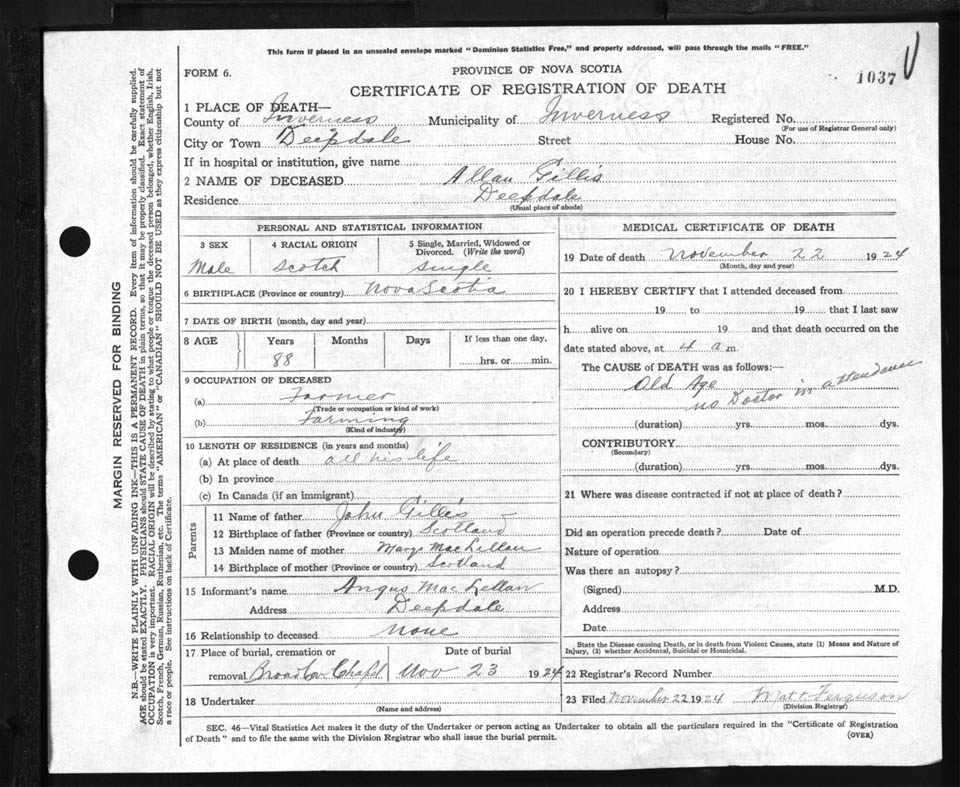 Male Death Registration: Year: 1924 file: 90 number: 1037