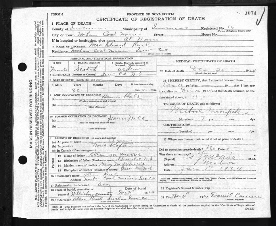 Female Death Registration: Year: 1924 file: 90 number: 1074