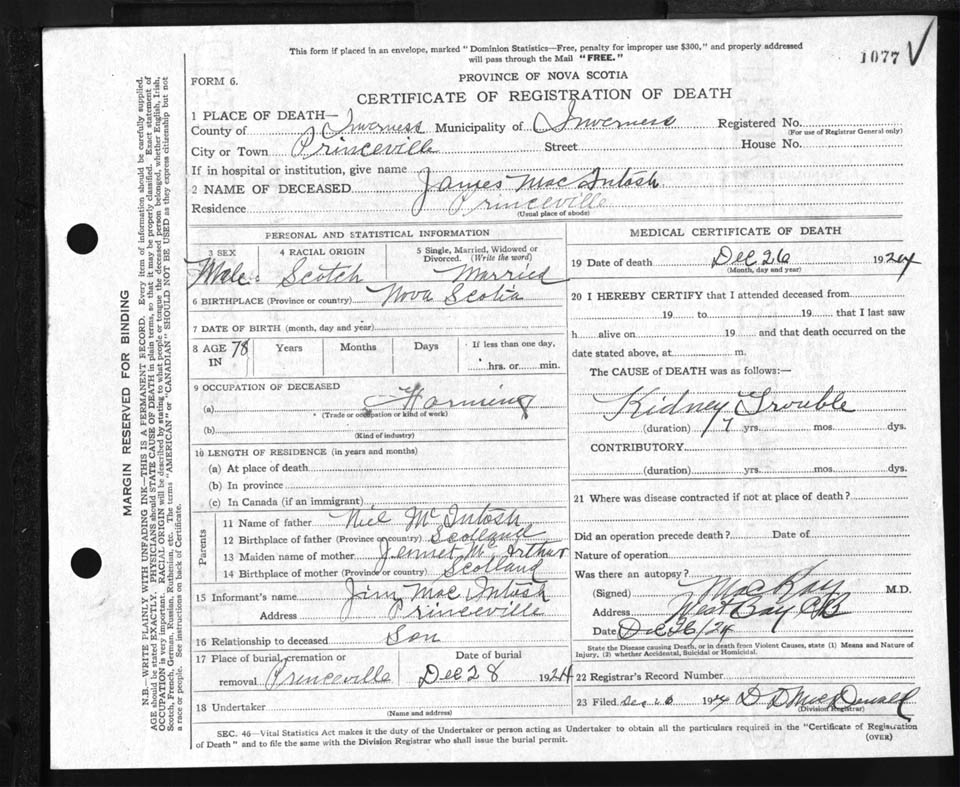 Male Death Registration: Year: 1924 file: 90 number: 1077