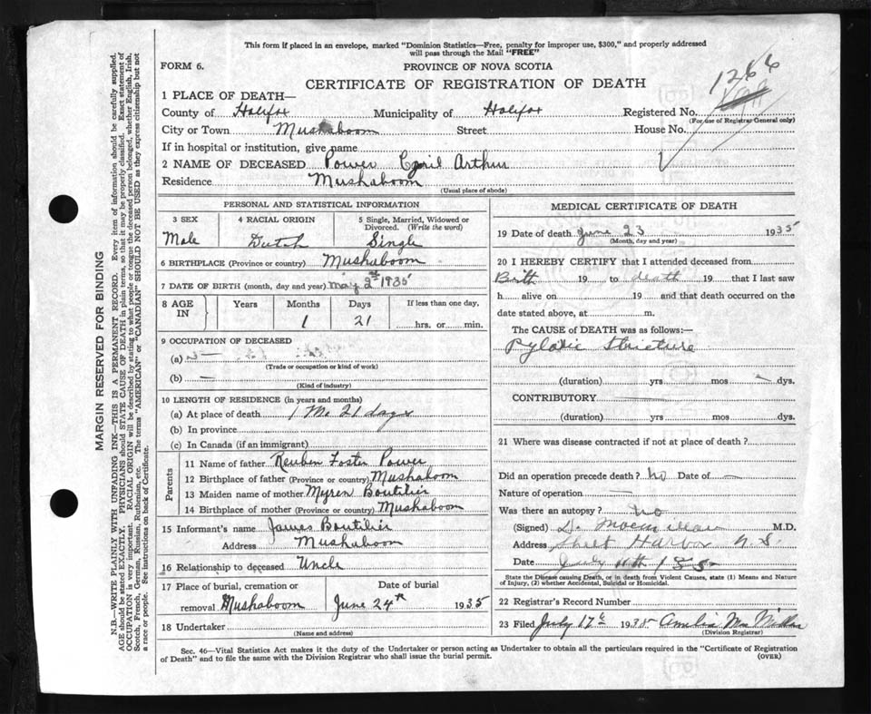 Male Death Registration: Year: 1935 file: 91 number: 1266