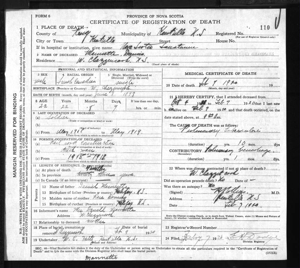 Male Death Registration: Year: 1920 file: 92 number: 110
