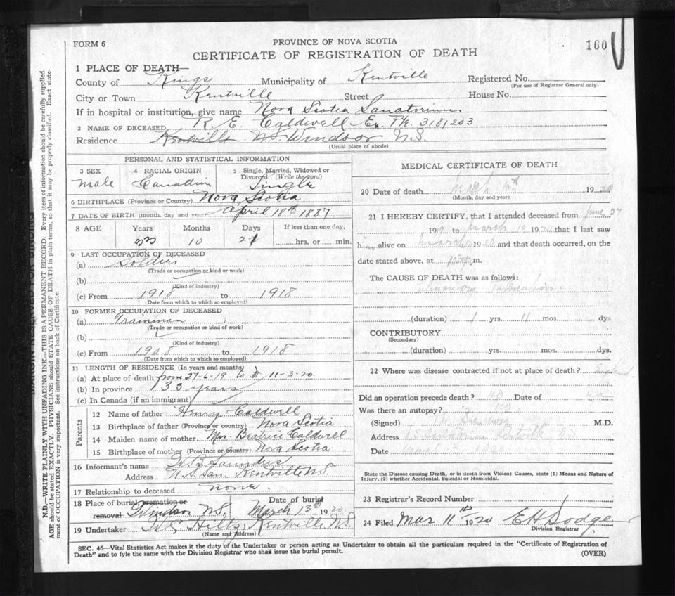 Male Death Registration: Year: 1920 file: 92 number: 160