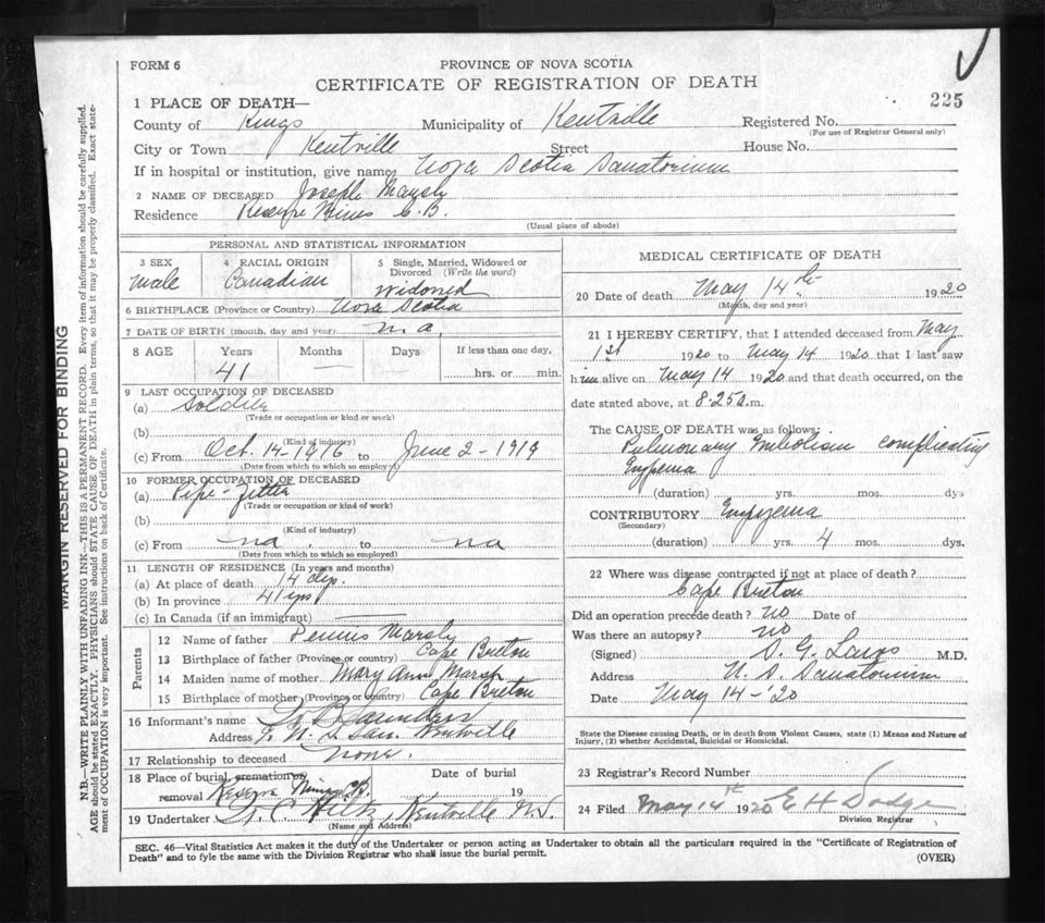 Male Death Registration: Year: 1920 file: 92 number: 225