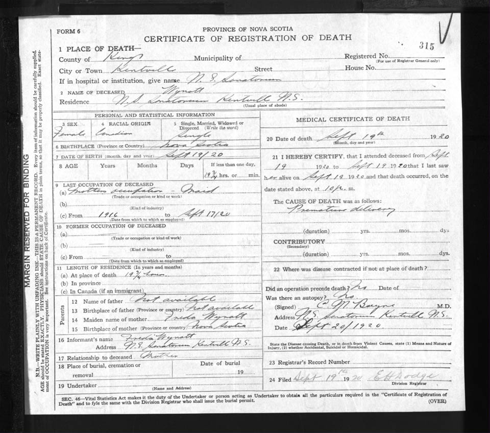 Female Death Registration: Year: 1920 file: 92 number: 315