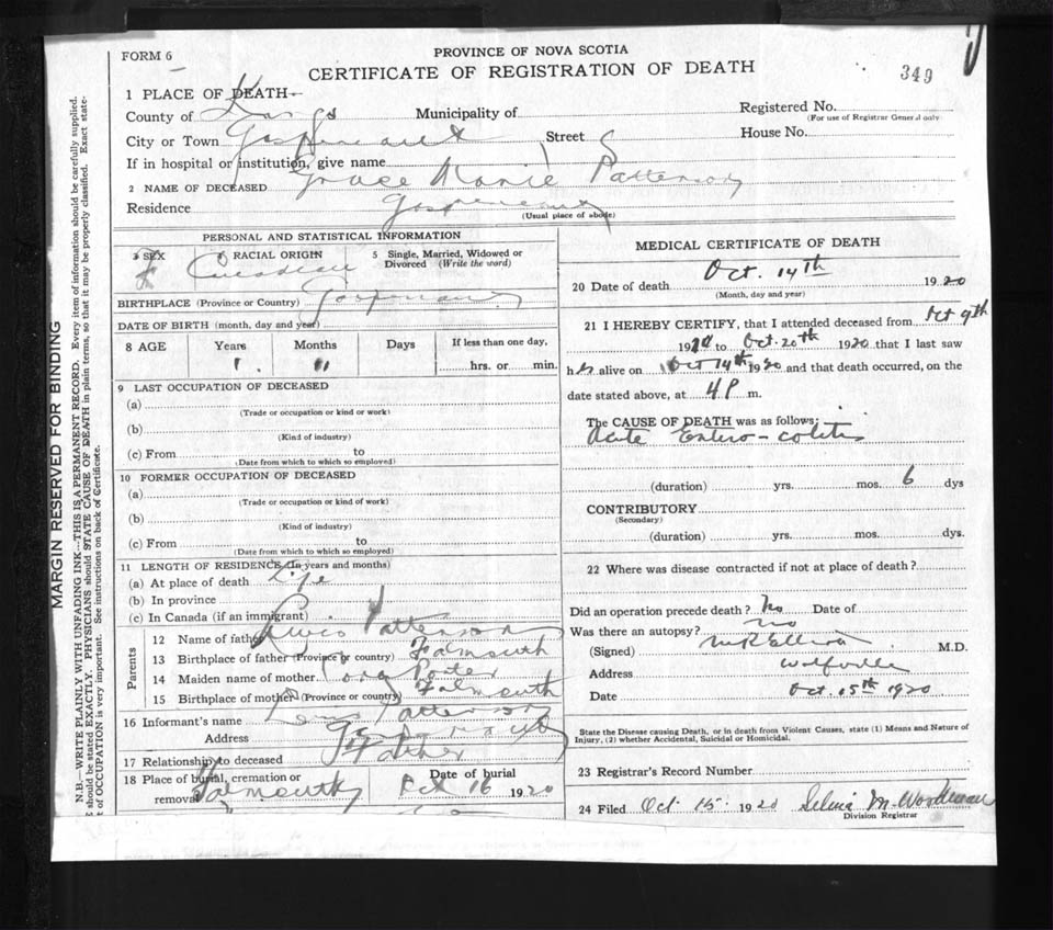 Female Death Registration: Year: 1920 file: 92 number: 349