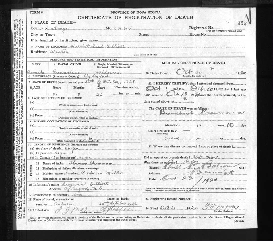 Female Death Registration: Year: 1920 file: 92 number: 356
