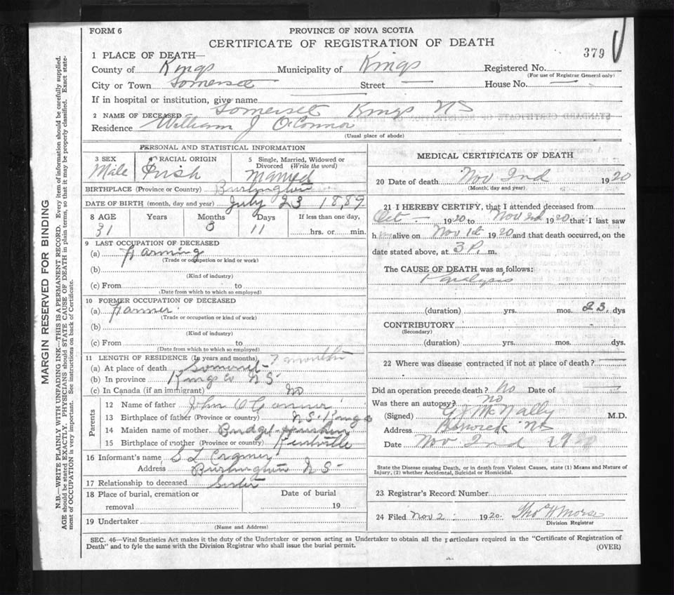 Male Death Registration: Year: 1920 file: 92 number: 379