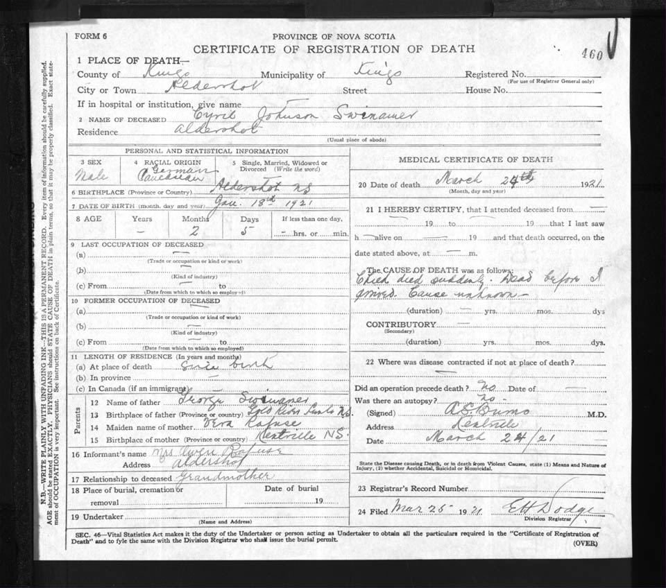 Male Death Registration: Year: 1921 file: 92 number: 460