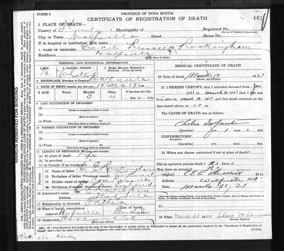Male Death Registration: Year: 1921 file: 92 number: 467