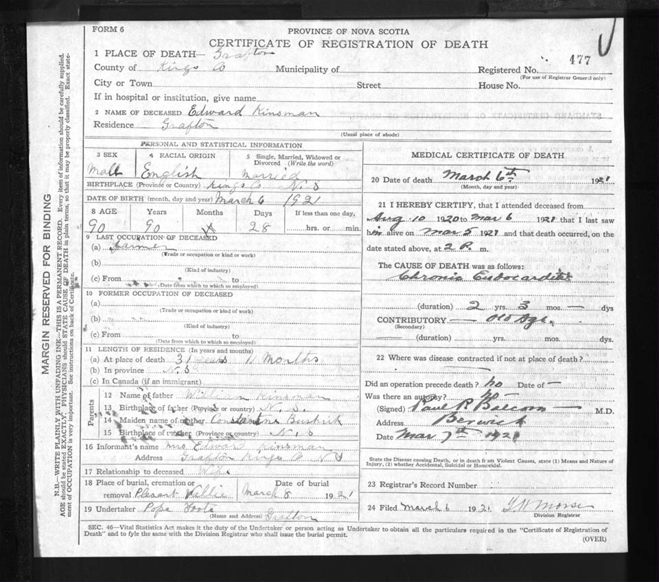 Male Death Registration: Year: 1921 file: 92 number: 477