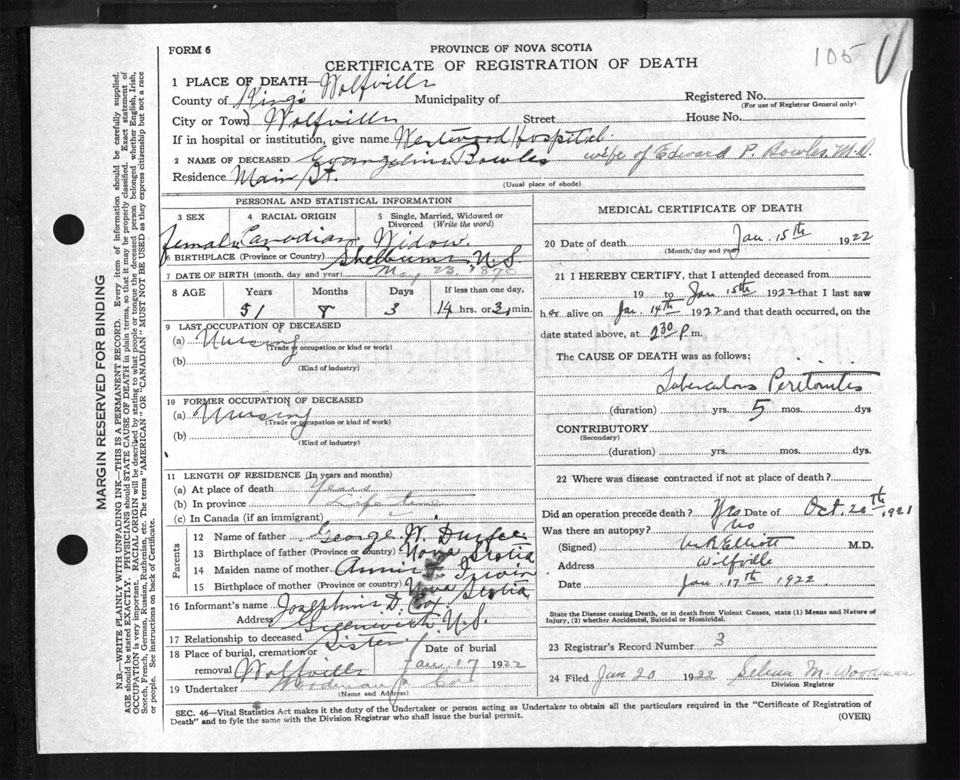 Female Death Registration: Year: 1922 file: 93 number: 105