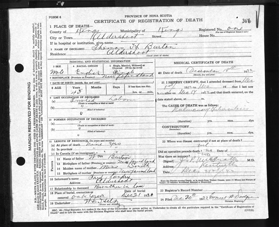 Male Death Registration: Year: 1922 file: 93 number: 386