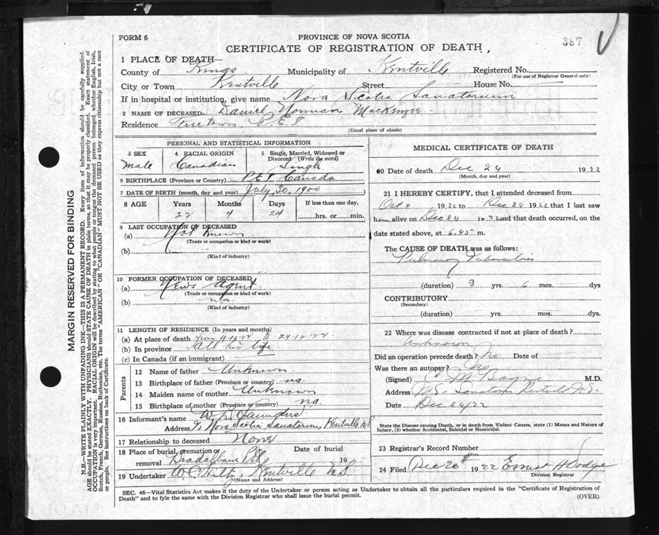 Male Death Registration: Year: 1922 file: 93 number: 387