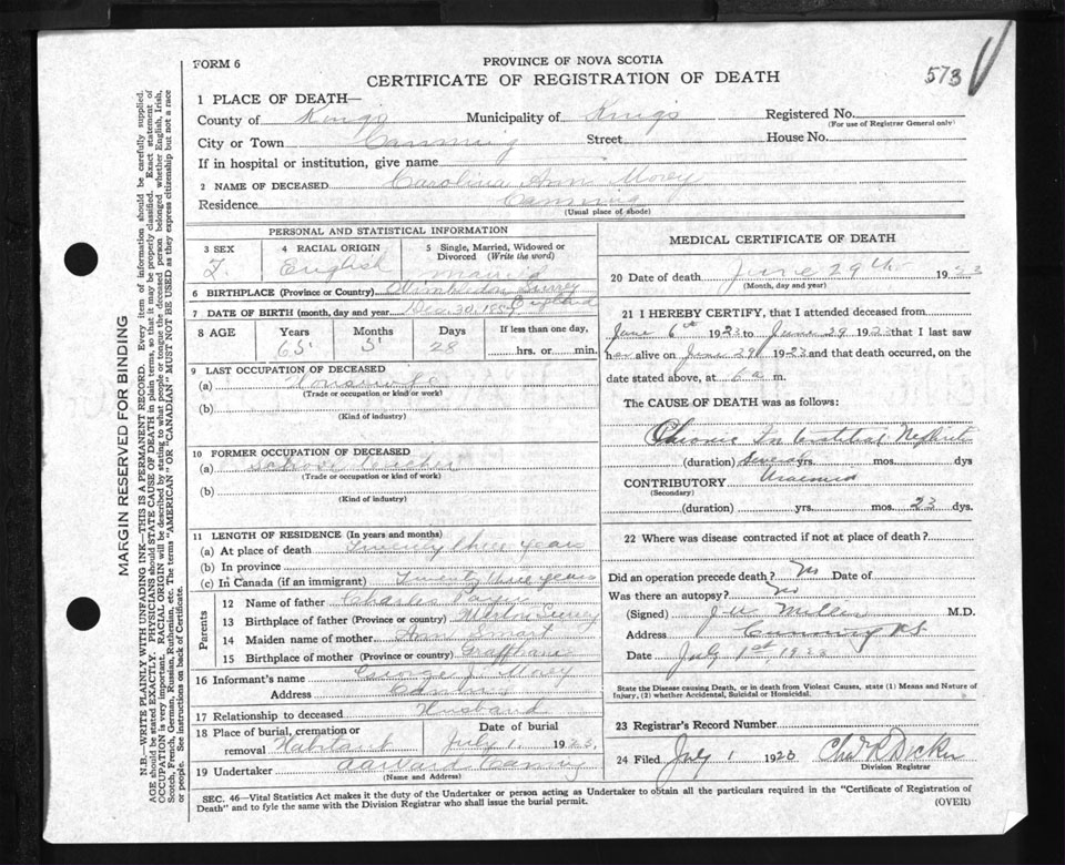 Female Death Registration: Year: 1923 file: 93 number: 573