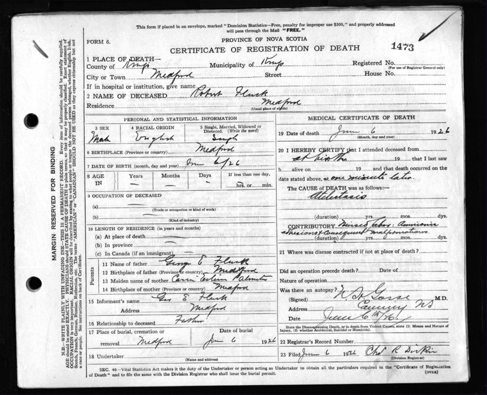 Male Death Registration: Year: 1926 file: 93 number: 1473