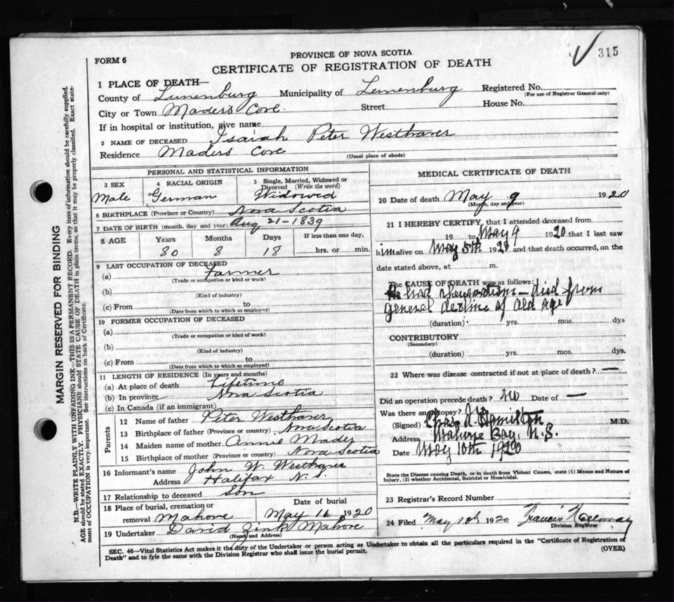 Male Death Registration: Year: 1920 file: 95 number: 315