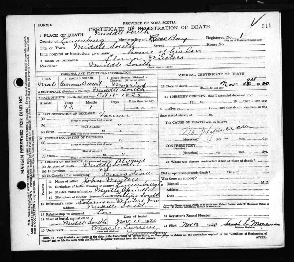 Male Death Registration: Year: 1920 file: 95 number: 514