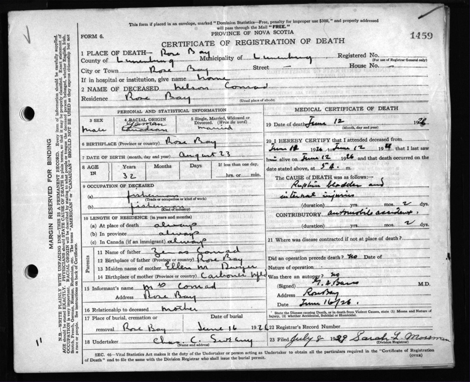 Male Death Registration: Year: 1926 file: 96 number: 1459