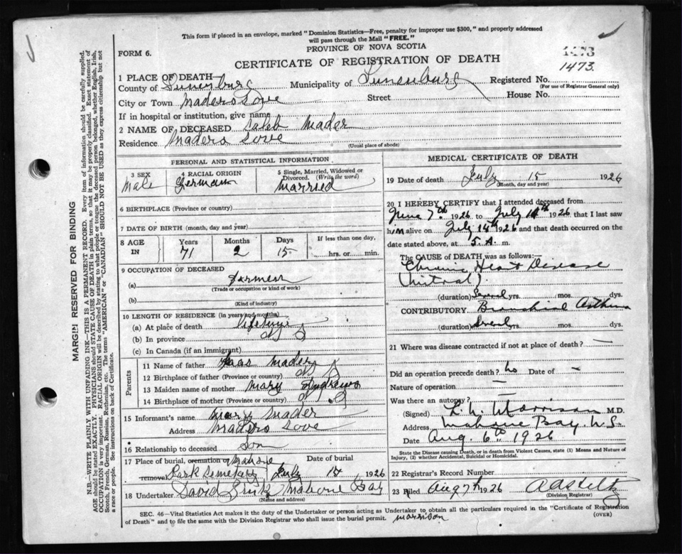 Male Death Registration: Year: 1926 file: 96 number: 1473