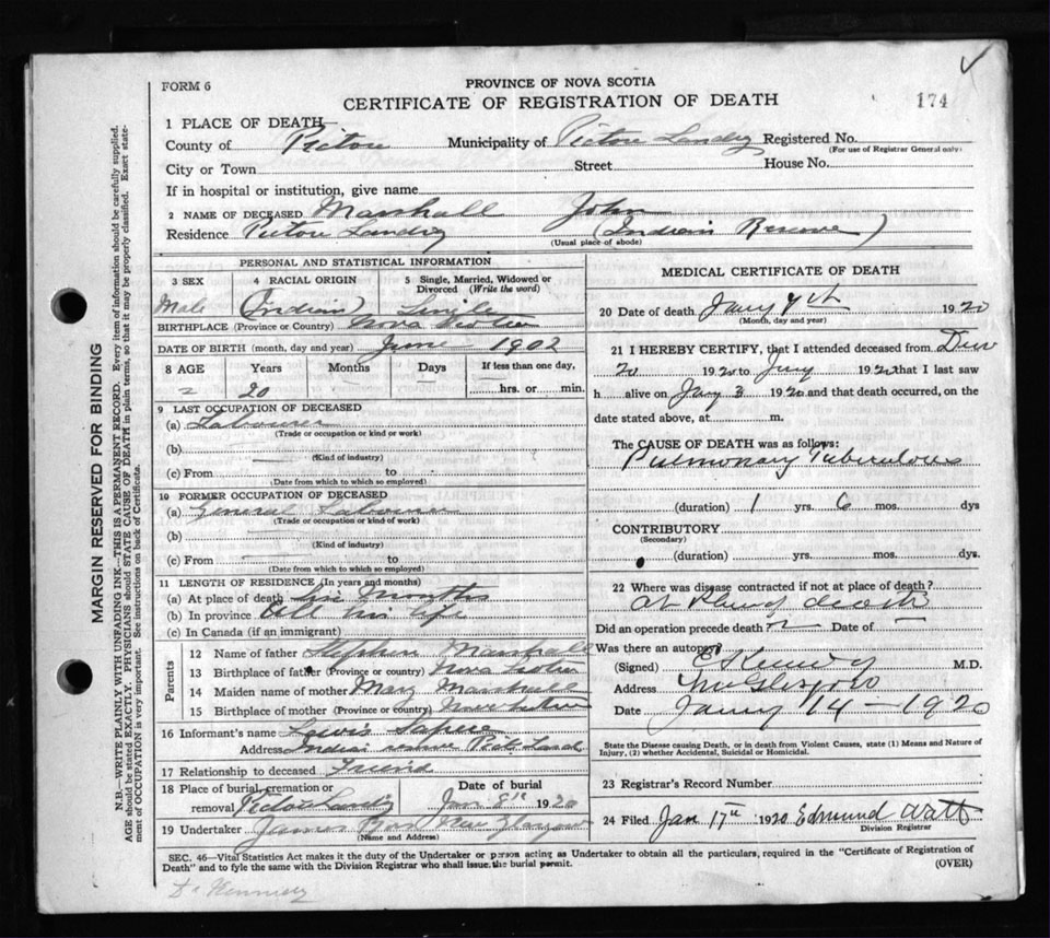 Male Death Registration: Year: 1920 file: 98 number: 174