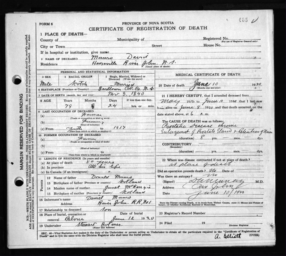 Male Death Registration: Year: 1920 file: 98 number: 455