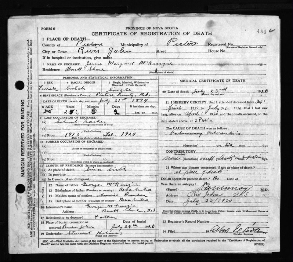 Female Death Registration: Year: 1920 file: 98 number: 494