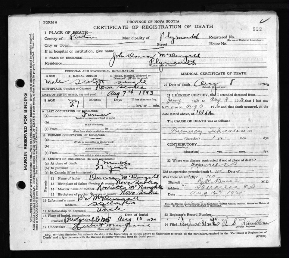 Male Death Registration: Year: 1920 file: 98 number: 522