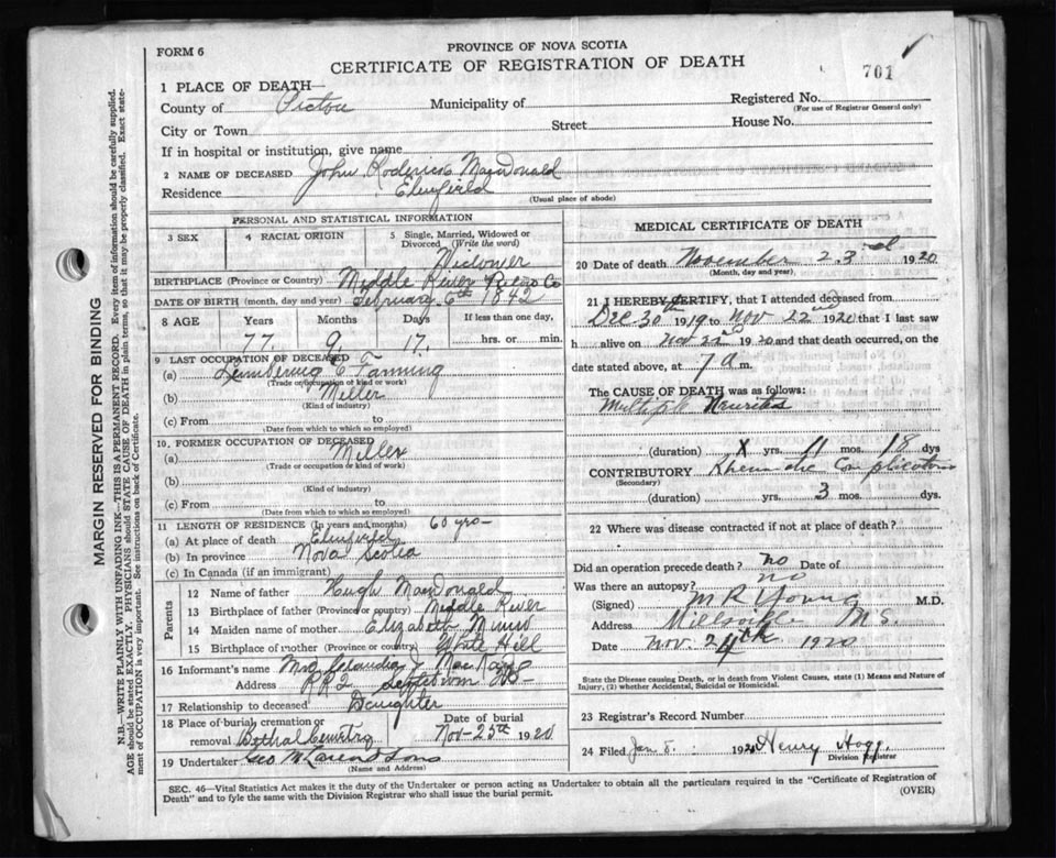 Male Death Registration: Year: 1920 file: 98 number: 701