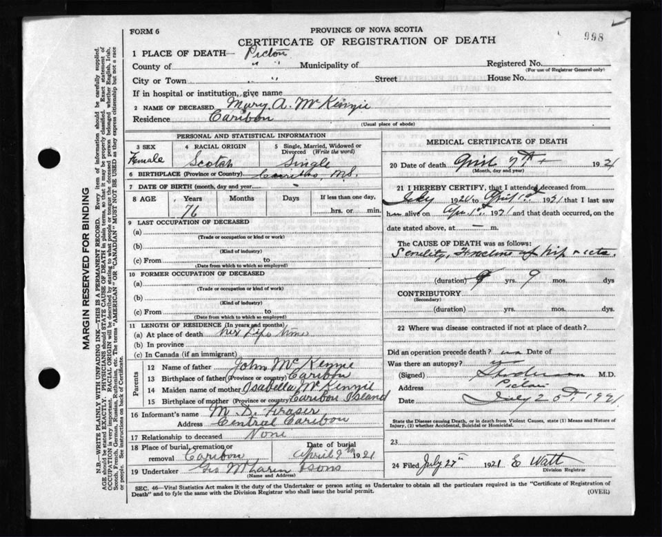 Death Registration: Year: 1921 file: 98 number: 998