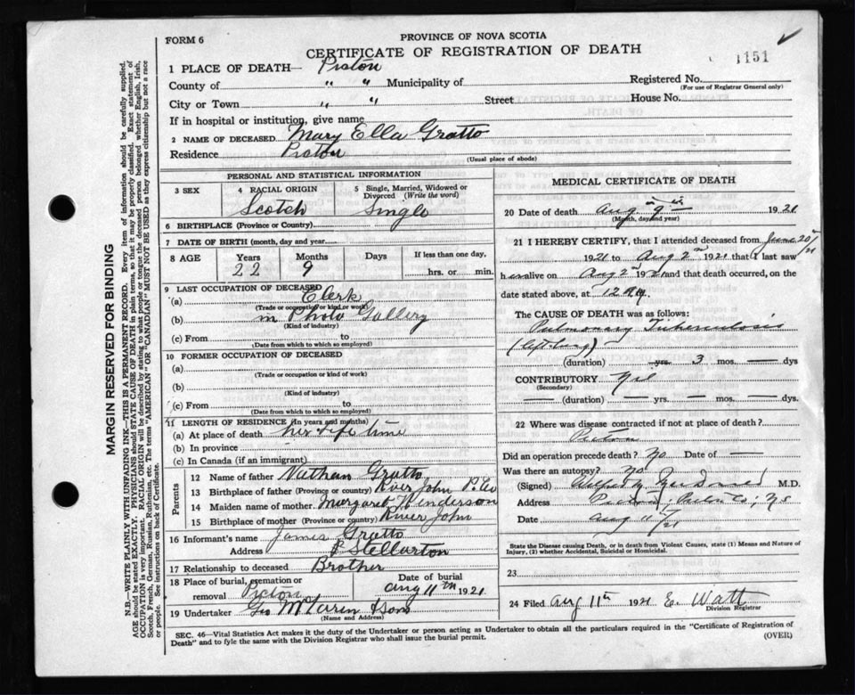 Death Registration: Year: 1921 file: 98 number: 1151