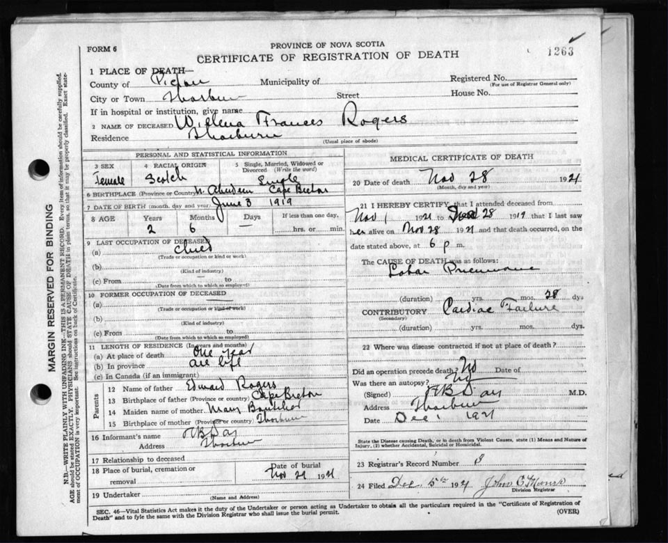 Death Registration: Year: 1921 file: 98 number: 1263