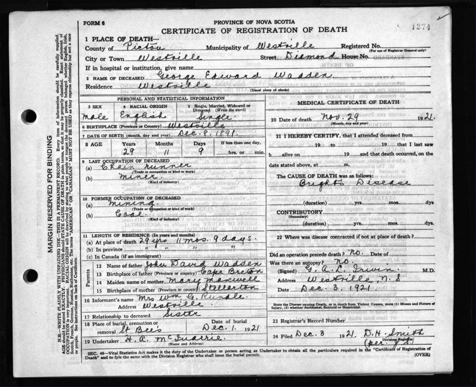 Death Registration: Year: 1921 file: 98 number: 1274