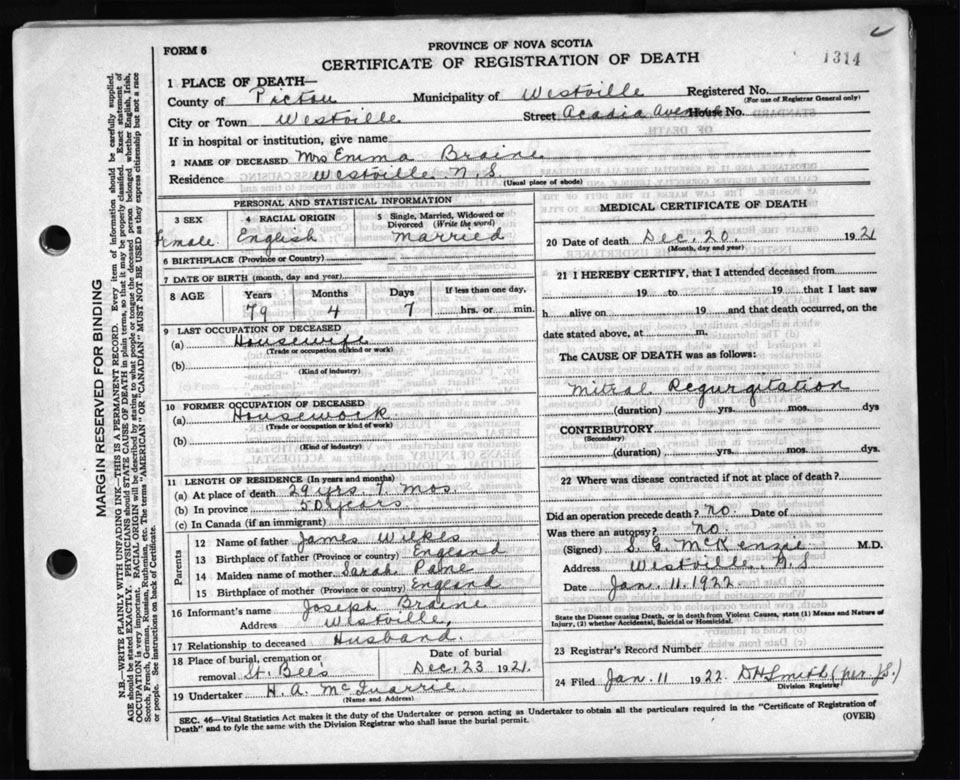 Death Registration: Year: 1921 file: 98 number: 1314