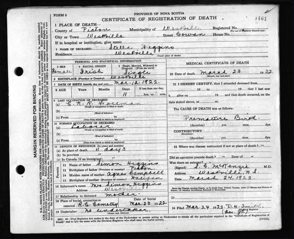 Death Registration: Year: 1922 file: 98 number: 1461