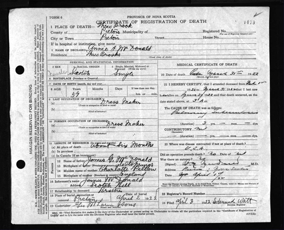 Death Registration: Year: 1922 file: 98 number: 1479