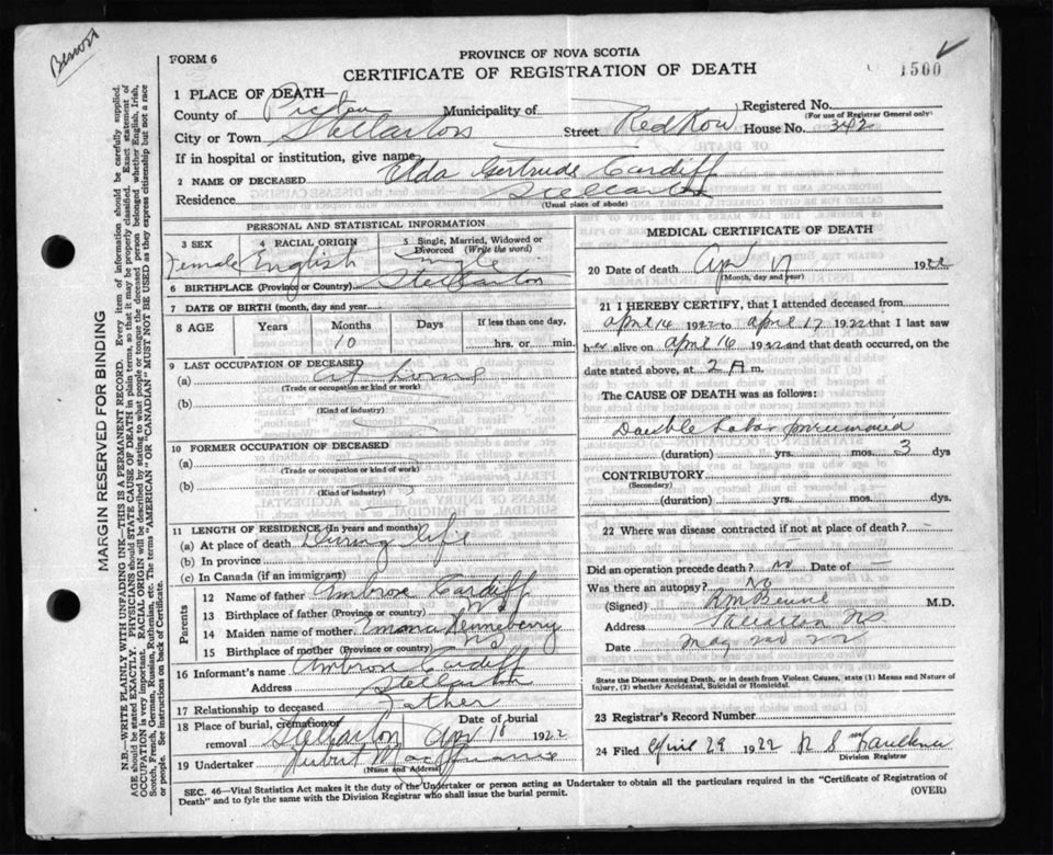 Death Registration: Year: 1922 file: 98 number: 1500