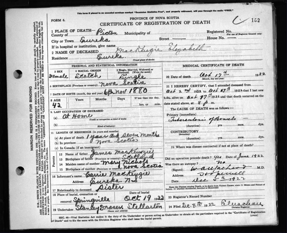 Death Registration: Year: 1922 file: 99 number: 152