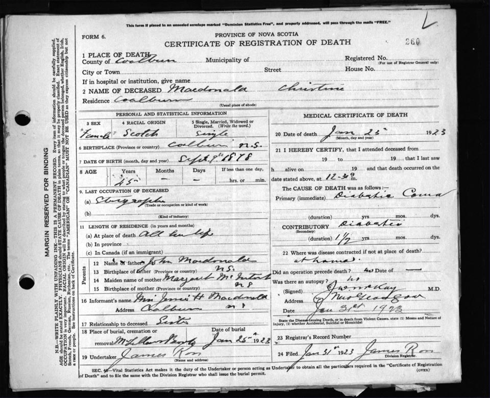 Death Registration: Year: 1923 file: 99 number: 260