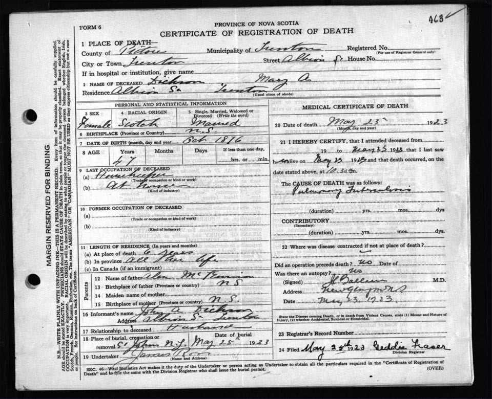 Death Registration: Year: 1923 file: 99 number: 463