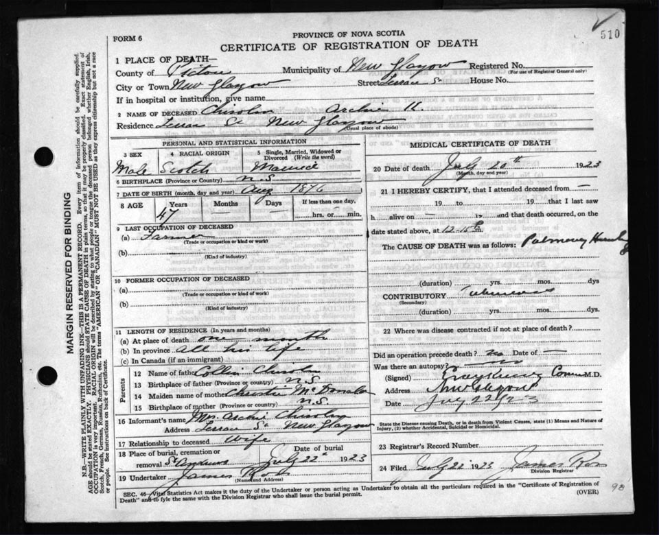 Death Registration: Year: 1923 file: 99 number: 510