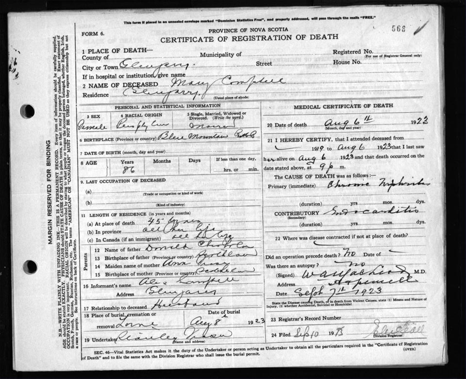 Death Registration: Year: 1923 file: 99 number: 566