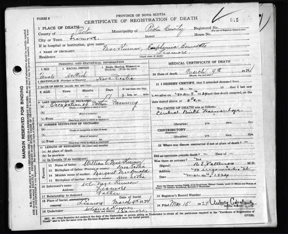 Death Registration: Year: 1924 file: 99 number: 915