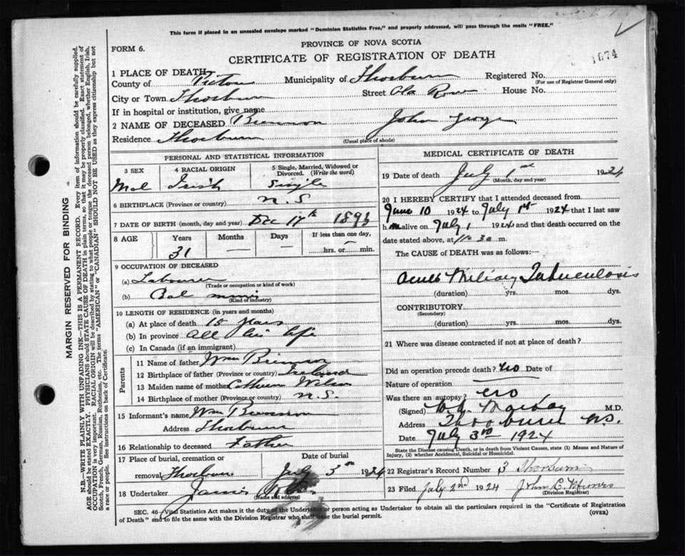 Death Registration: Year: 1924 file: 99 number: 1074
